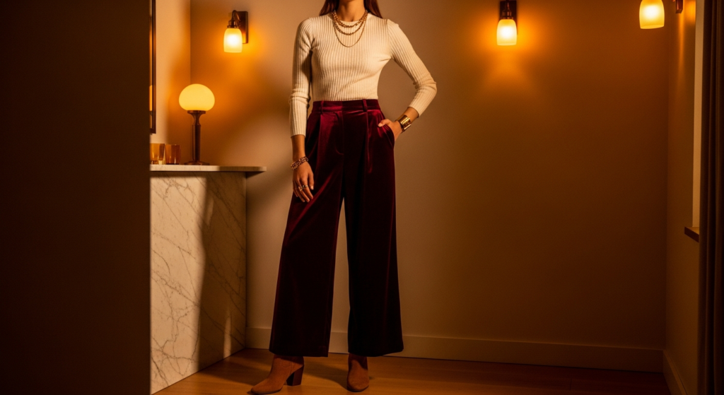 Velvet is autumn and winter’s most luxurious fabric — rich, tactile, and deeply beautiful in the warm, low light of the season. On Pinterest, velvet-forward fall outfit inspo images consistently generate some of the highest saves of the entire autumn fashion cycle.