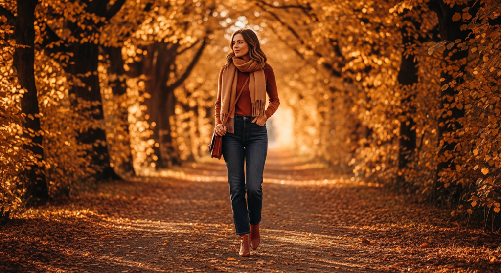 The outfit that feels like autumn itself — warm, grounded, and endlessly beautiful in golden-hour light.