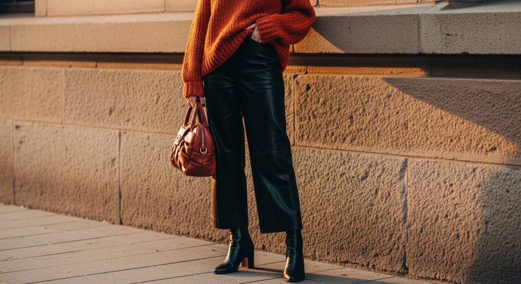 - Choose a sweater in a warm autumn tone: burnt orange, deep rust, oatmeal cream, or rich chocolate brown — these shades perform beautifully against the sleek leather trouser.