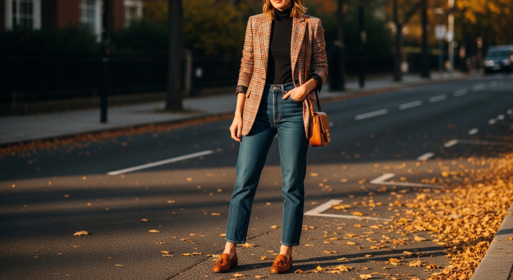 Plaid is autumn’s signature print — and nowhere does it look more refined and effortlessly stylish than in a well-cut blazer paired with clean dark denim. This is fall outfit inspo that bridges smart casual and elevated everyday dressing beautifully.