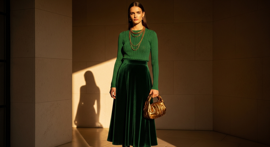 - Choose fabrics that enhance color depth: velvet, satin, wool, and crepe all absorb and reflect jewel tones more beautifully than casual fabrics.