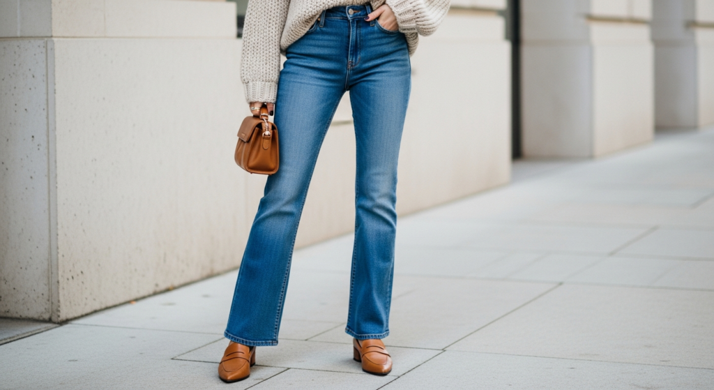 A modern, trend-forward fall denim look that photographs beautifully against autumn’s natural color palette.