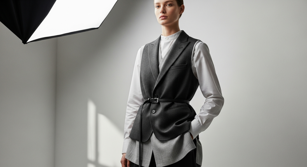 Layering a vest over an oversized shirt introduces dimension and structure.