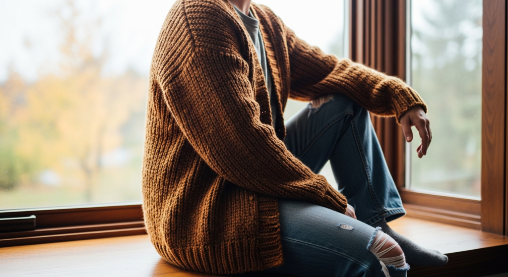 A relaxed cardigan paired with denim creates a soft, everyday look.