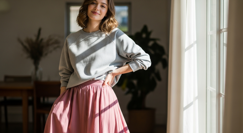 Combining a loose sweatshirt with a structured skirt creates contrast and movement.