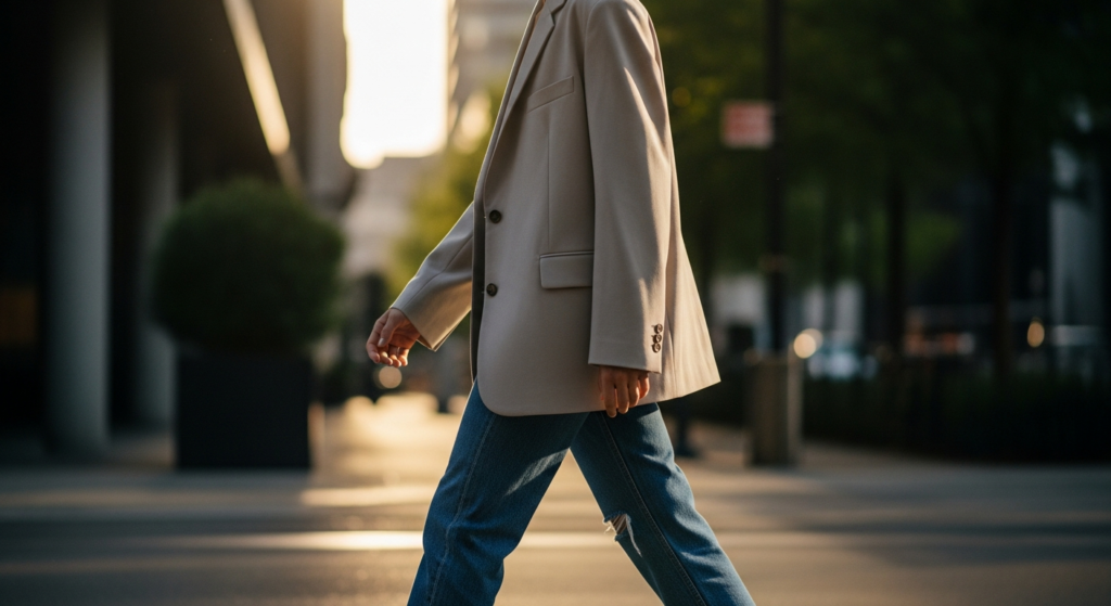 An oversized blazer introduces structure, while straight-leg jeans keep the look grounded.