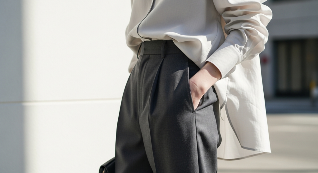 A loose shirt paired with tailored trousers creates a refined contrast between relaxed and structured elements.