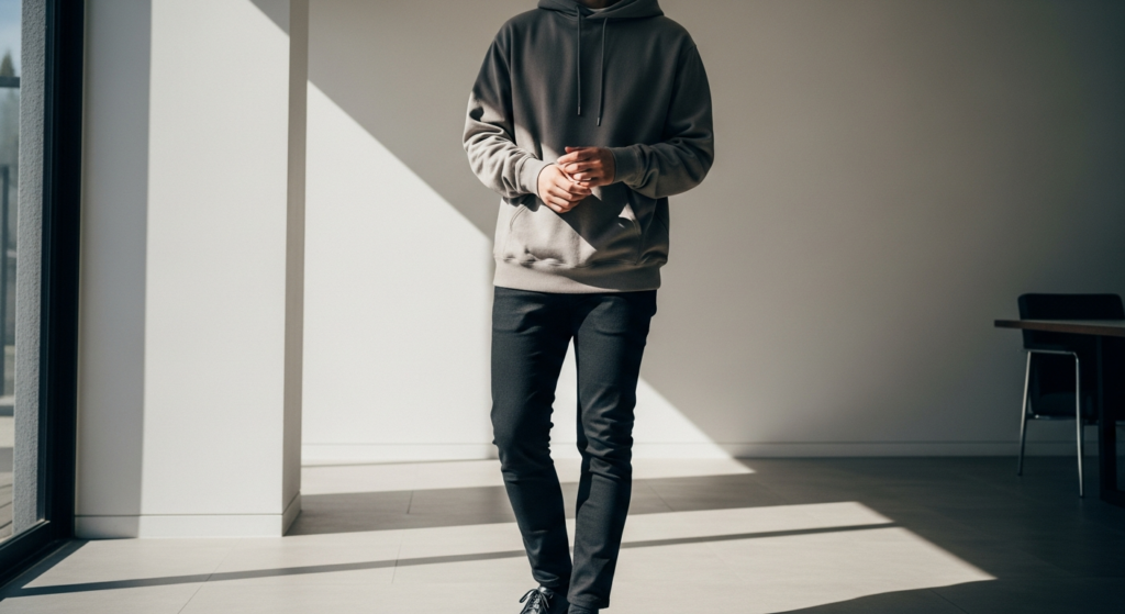A voluminous hoodie combined with slim-fit pants creates a balanced and modern silhouette.