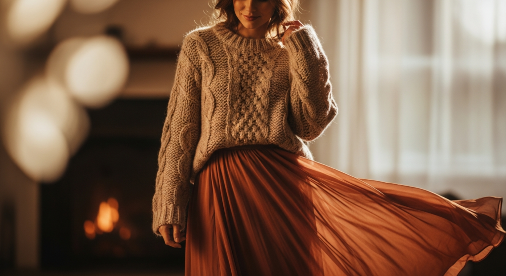 Soft oversized knits paired with a flowing midi skirt create movement and texture.