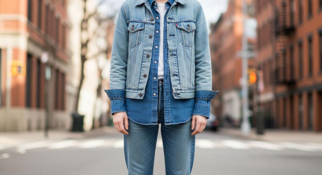 Layering an oversized denim jacket over simple basics creates a timeless casual outfit.