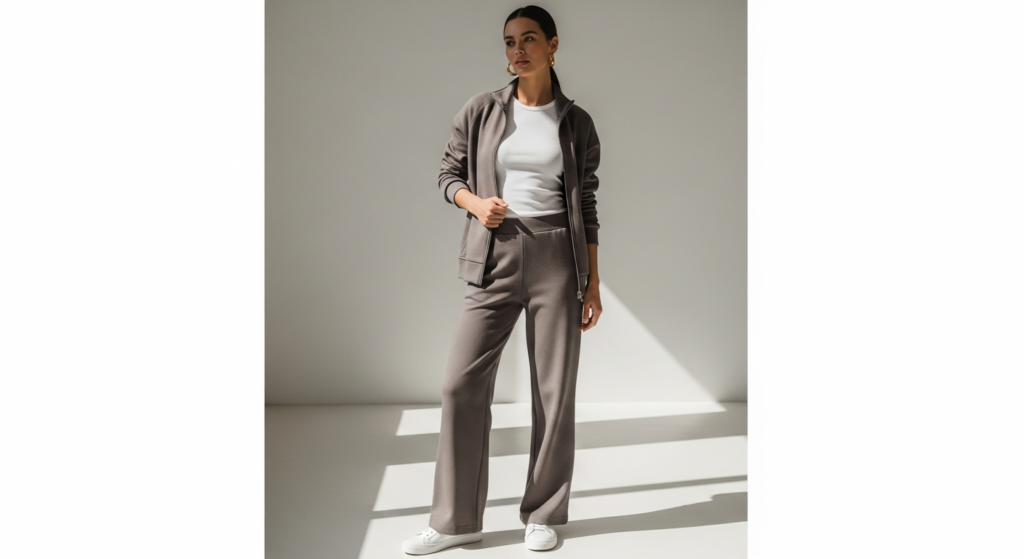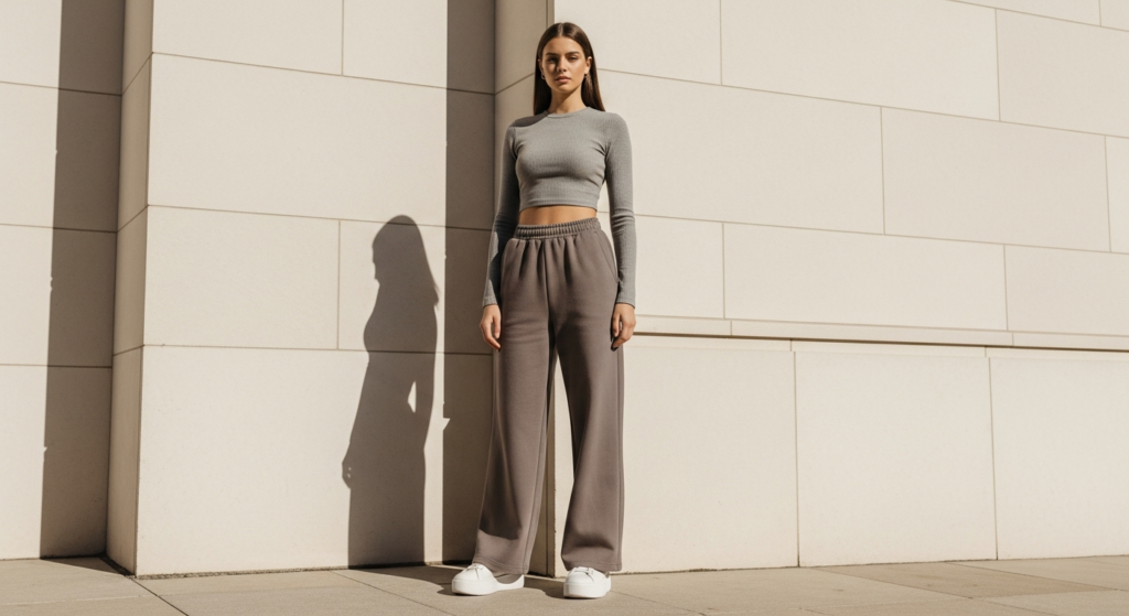 Styling Tip: Choose wide-leg sweatpants in a premium heavyweight cotton or terry in a neutral tone. The fit at the waist should be high and well-fitted — it is the waist definition that makes the wide leg look flattering rather than overwhelming. Pair with a simple ribbed or cotton fitted crop top in the same or complementary tone. Add clean white platform trainers for height and proportion, and a small crossbody bag. Keep accessories minimal — a single ring, a fine chain necklace — to maintain the clean, modern quality of this look.