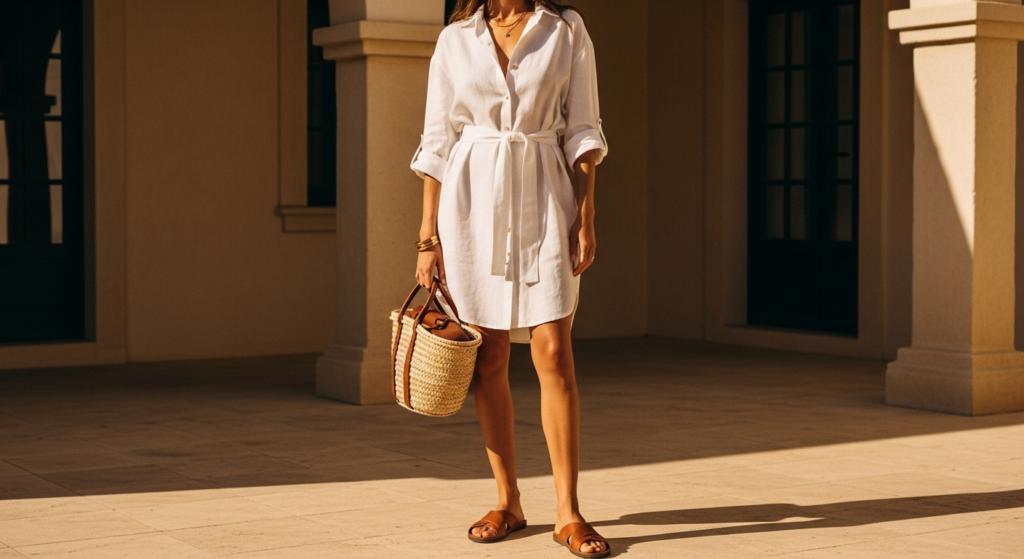 Styling Tip: Choose a linen shirt dress in a warm neutral — warm white, soft sand, pale sage, or dusty denim blue — in a length that falls to the mid-calf or knee for the most versatile and flattering result. Wear unbelted and slightly undone — two buttons open at the neckline, sleeves rolled once — for the most effortless aesthetic. Add leather sandals or clean white trainers, a woven basket bag, and delicate gold jewellery. The beauty of this outfit is its single-piece simplicity — no coordinating required.