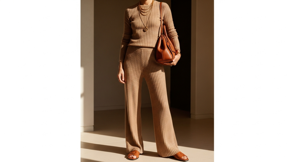 Styling Tip: Choose a ribbed lounge set in a quality cotton or bamboo blend — the fabric should have enough weight to drape beautifully rather than clinging. Warm sand, cream, warm grey, sage green, and soft brown are the most elegant ribbed lounge set colours. The elevation comes entirely from the accessories — add gold layered necklaces, a quality leather tote or structured bag, clean leather slides or loafers, and well-applied minimal makeup. The contrast between the casual comfort of the ribbed set and the intentionality of the accessories creates a look of effortless, expensive ease.