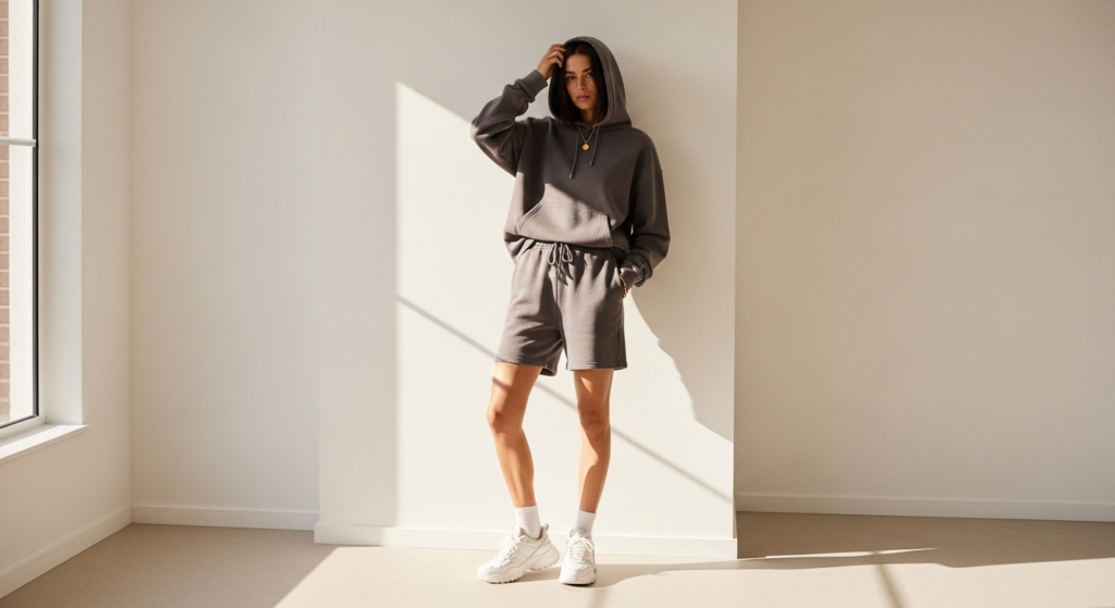 Styling Tip: The matching element is everything in this outfit — the hoodie and shorts must be from the same set, in precisely the same tone, for the monochrome effect to read as intentional rather than accidental. Choose the set in a quality cotton fleece or brushed jersey in a warm neutral — faded black, warm grey, cream, or soft brown. Add chunky white trainers, a small structured bag, simple gold jewellery, and a clean, minimal makeup look. Wear the hoodie with the hood down for a cleaner silhouette and a more polished overall impression.