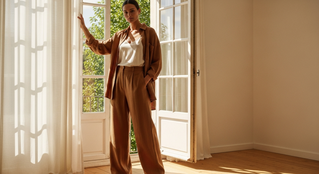 A matching linen co-ord — wide-leg trousers and an oversized short-sleeve shirt in the same fabric — is the lazy day outfit for those who believe that slow mornings deserve beautiful clothes. Linen’s natural texture, breathability, and effortless drape make it the most aesthetically elevated fabric in the comfort dressing category.