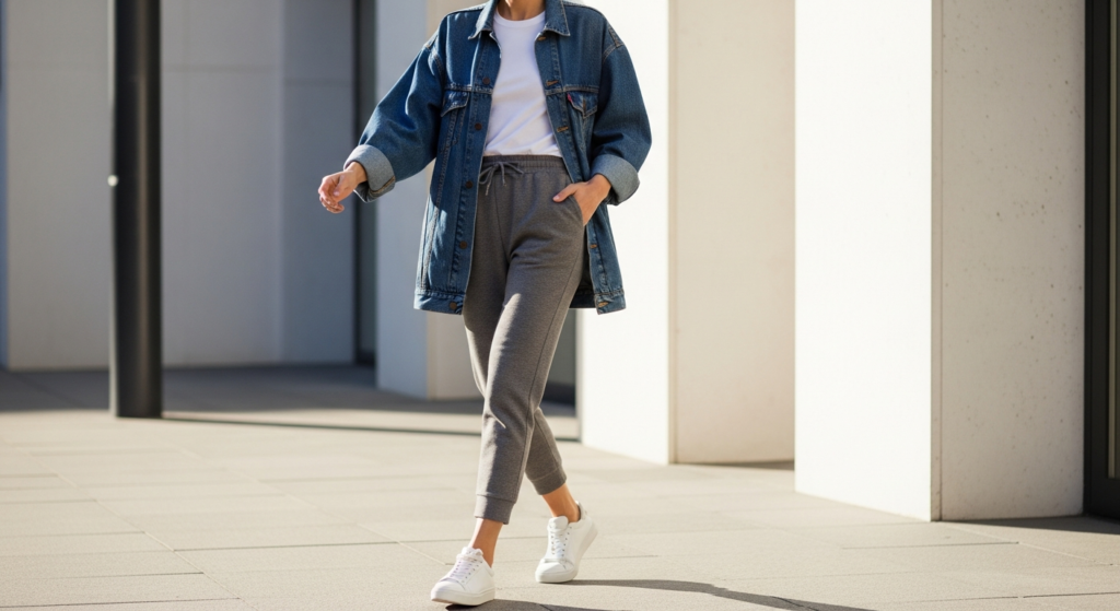 An oversized denim jacket worn over a simple fitted tee and paired with premium joggers or wide-leg sweatpants is one of the most classic and enduringly stylish cute lazy day outfits available. The structure of the denim jacket elevates the softness of the jogger bottom, creating a look that feels casual but carefully considered.