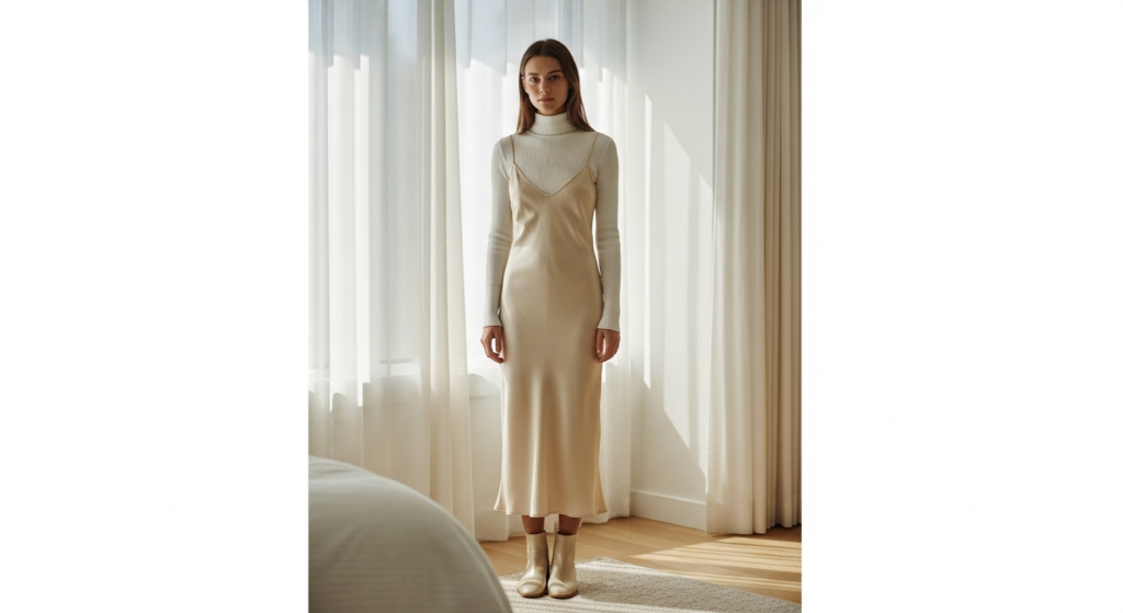 Layering a satin or modal slip dress over a long-sleeve fitted top — turtleneck, ribbed top, or simple crew neck — is one of the most unexpectedly elegant and creative cute lazy day outfit approaches. It takes two simple pieces and transforms them into a look with genuine editorial quality and surprising versatility.