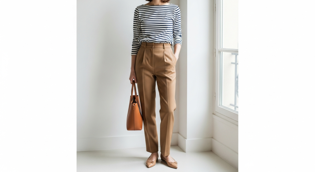 The striped top and tailored trouser combination is the quintessential French girl outfit — understated, intelligent, and effortlessly stylish without appearing to try too hard.