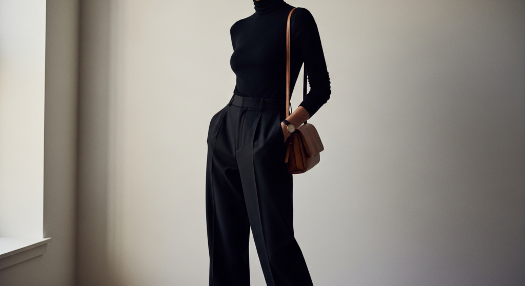 • A fitted black turtleneck tucked into black wide-leg trousers is one of the most elegant simple outfit formulas in existence.