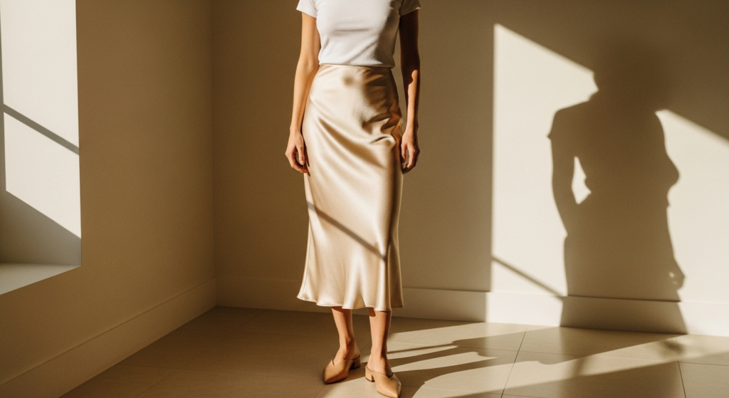 The combination of a sleek satin or crinkle slip skirt with a simple fitted tee is a masterclass in effortless styling. It brings together casual and refined in a way that feels modern and understated.