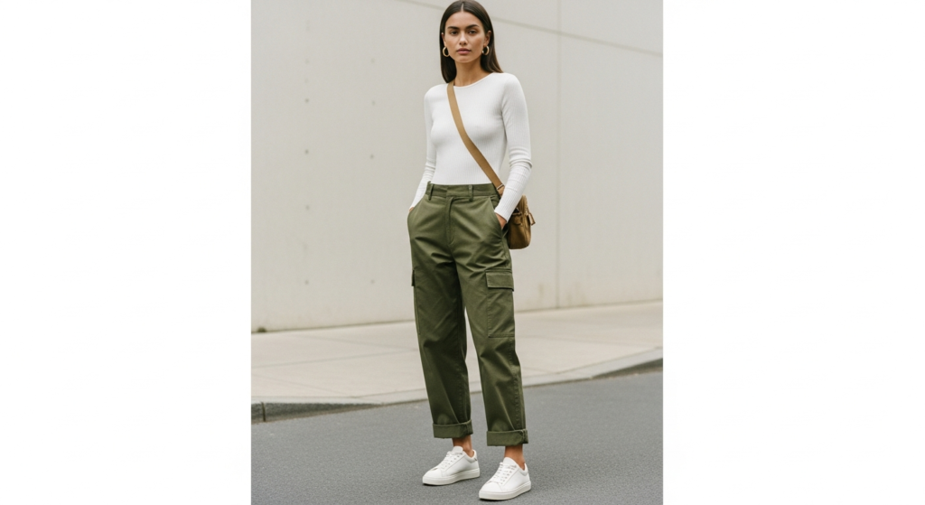 Cargo pants have made a major fashion comeback, and when balanced with a sleek fitted bodysuit, they create one of the most contemporary cute simple outfit combinations available right now.