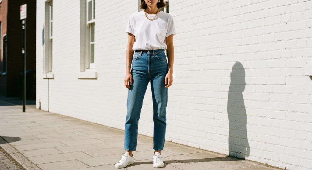 If there’s one outfit that has stood the test of every fashion decade, it’s the white t-shirt and high-waist jeans combination. It’s the foundation of effortless style — clean, versatile, and endlessly adaptable.