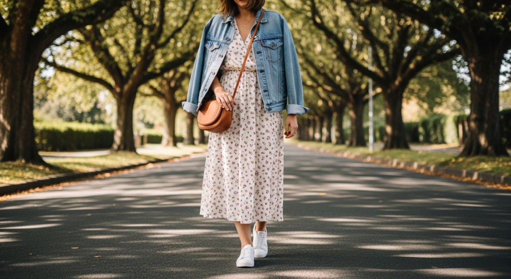 Layering a classic denim jacket over a feminine floral dress is one of the most beloved cute simple outfit pairings in modern fashion — it balances softness with edge and always looks intentionally styled.