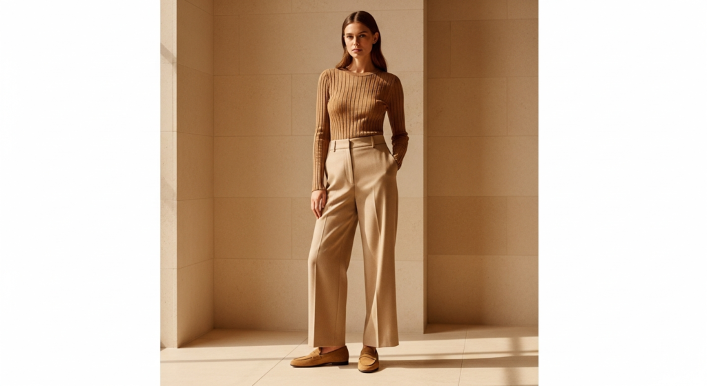 • Pair with tailored high-waist trousers in camel, cream, or charcoal — straight-leg or slightly wide silhouettes work best.