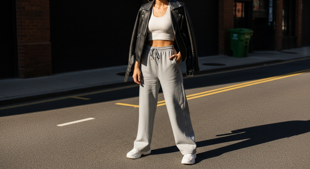 Styling Tip: Choose premium athleisure pieces in neutral, elevated tones — warm grey, deep navy, cream, or warm black — that complement the leather jacket rather than creating a sporting-gear aesthetic. Fitted wide-leg joggers in a quality fleece or jersey, worn with a simple fitted sports crop or ribbed long-sleeve top, create the ideal base. Add the leather jacket open over the top, chunky white or neutral trainers, gold hoop earrings, and a small crossbody bag. The accessories are what bridge the gap between gym-ready and genuinely stylish in this outfit combination.