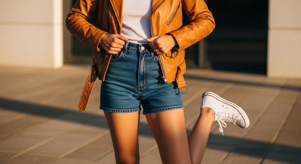 A vintage or slightly worn leather jacket — with natural patina, softened leather, and the beautiful character that only genuine age and wear can create — worn over a simple tee with high-waist denim shorts is the most authentically cool and most summer-appropriate leather jacket outfit available. It is a look with genuine provenance and an aesthetic confidence that new jackets rarely achieve.