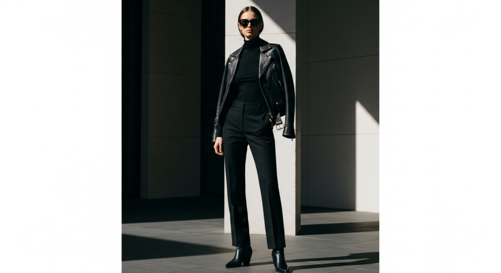 Styling Tip: Build the all-black monochrome leather jacket outfit in layers of varying texture for visual depth and sophistication — a fine black ribbed turtleneck, black straight-leg tailored trousers or black well-fitted jeans, a black leather jacket in a clean minimal design, and black ankle boots or pointed-toe pumps. The variation in texture — the fine knit, the smooth denim or crepe, the leather — creates the visual richness that prevents a head-to-toe black outfit from reading as flat or one-dimensional. Add a single silver or gold accessory — a watch, a ring, or a fine chain — for the only point of contrast the look needs.