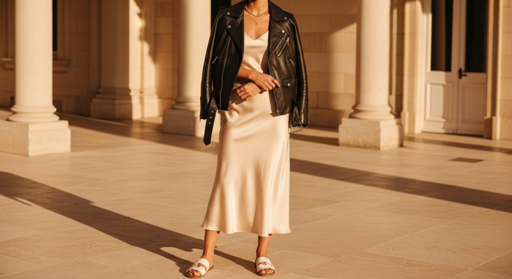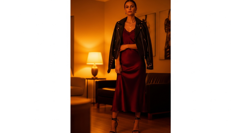 Styling Tip: Choose a slip dress in a rich, evening-appropriate tone — deep champagne, dusty rose, midnight blue, or rich burgundy — and wear a black or deep cognac leather jacket over it, open at the front. The contrast between the liquid drape of the satin and the structured solidity of the leather creates the most compelling visual tension of any leather jacket combination. Add strappy heeled sandals or pointed-toe ankle boots, minimal gold jewellery, and a small clutch or simple structured bag for a complete evening look that feels entirely personal and entirely original.