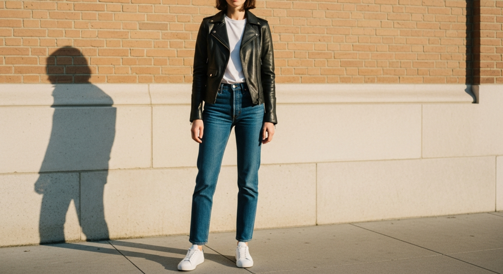 The black leather jacket over a white tee and clean straight-leg jeans is the most fundamental and most enduringly perfect leather jacket outfit in existence. It is the look that requires no occasion, no styling effort, and no justification — simply a quality jacket, a good tee, and well-fitted denim worn with complete confidence.