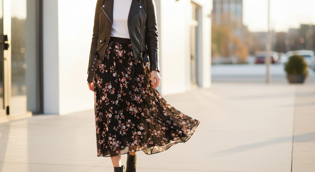 Styling Tip: Choose a floral midi skirt in a lightweight fabric — chiffon, satin, or cotton lawn — with a print that includes at least one dark tone that the leather jacket can echo or complement. A floral skirt with deep navy or black in the print, worn under a black leather jacket, creates a beautifully cohesive rather than contrasting combination. Add ankle boots or simple block-heel mules and a small crossbody bag. Tuck a fitted tee or fine knitwear into the skirt beneath the jacket for the most polished overall composition.