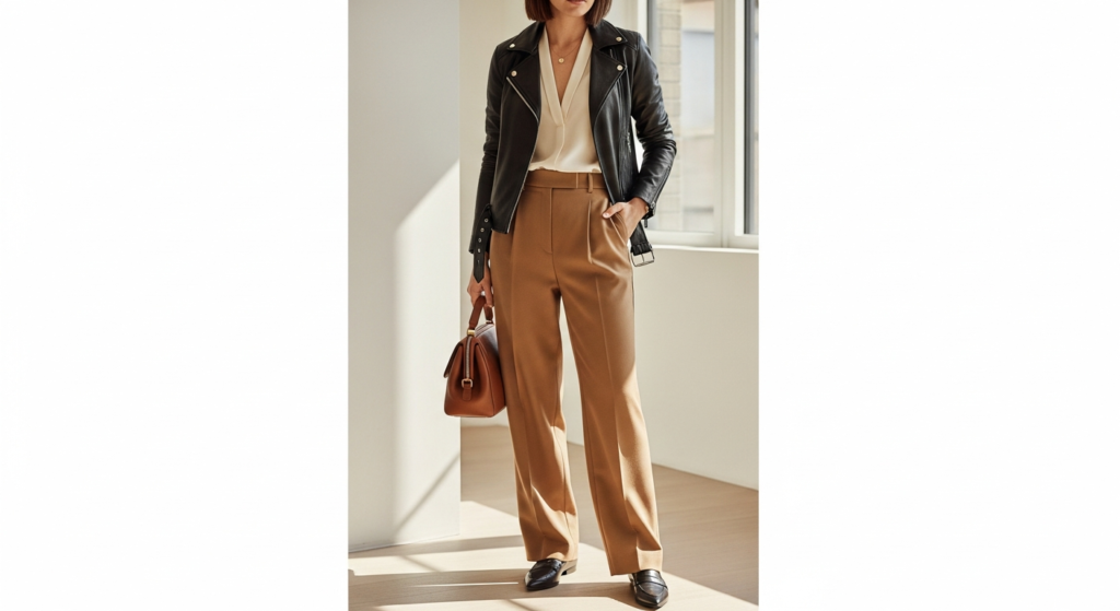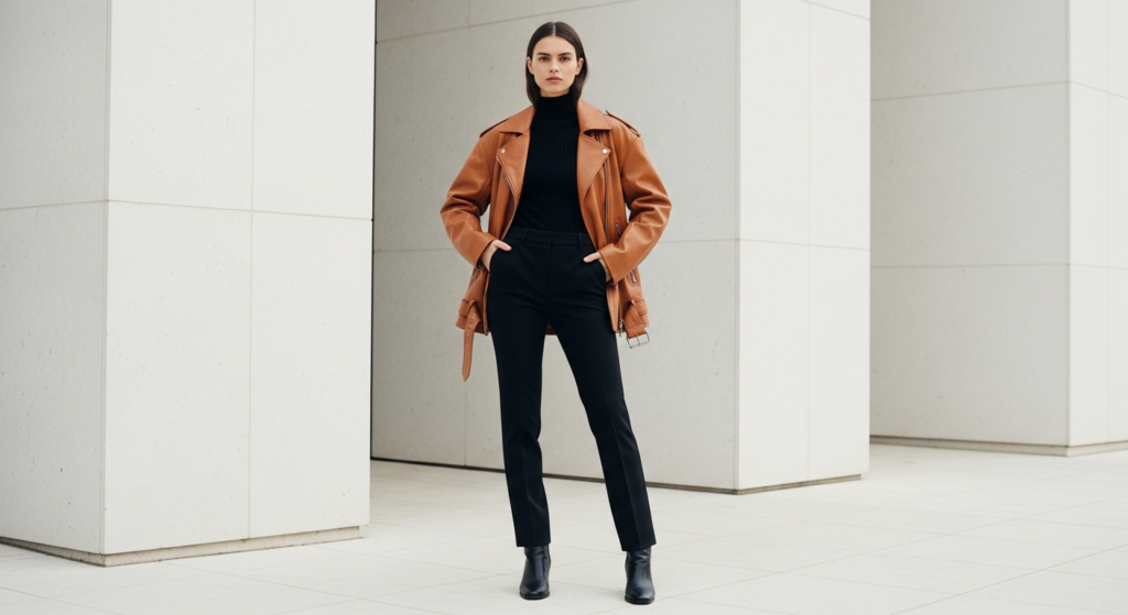 The leather jacket worn over a quality blouse or fine knitwear with tailored straight-leg or wide-leg trousers is the smart-casual leather jacket outfit — the look that bridges the gap between the jacket’s inherently casual energy and the more polished register of professional or semi-formal occasions. It is one of the most useful and most underexplored leather jacket styling approaches available.