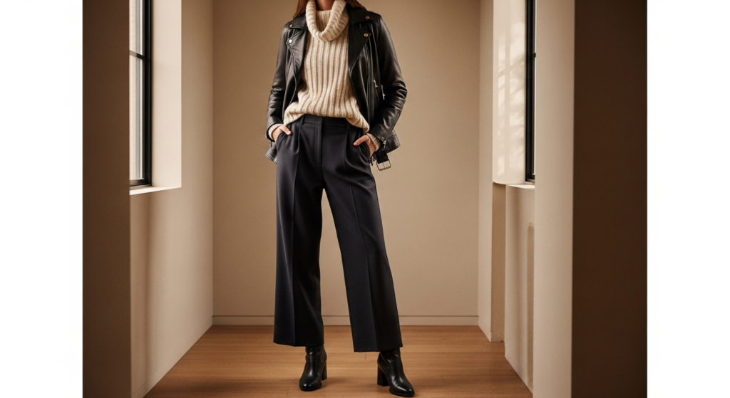 Styling Tip: Choose a knit in a warm neutral — cream, warm grey, camel, or oatmeal — that complements rather than competes with the tone of the leather jacket. Wear the knit loosely tucked or fully tucked into high-waist wide-leg trousers in a complementary neutral — dark charcoal, deep navy, or warm camel — and add the leather jacket as the final structural layer. Clean leather ankle boots or heeled boots complete the look. The combination of leather, knitwear texture, and the clean line of wide-leg trousers creates a genuinely editorial autumn and winter outfit of real quality.