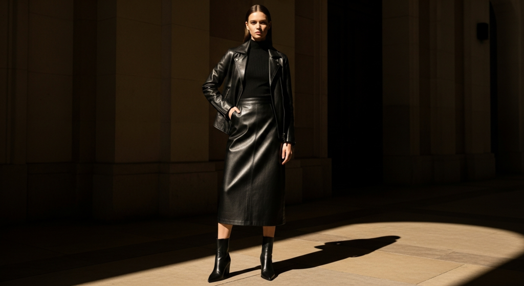 Wearing a leather jacket with a matching or tonal leather midi skirt — head-to-toe leather in the same or complementary shade — is the most bold and most fashion-forward leather jacket outfit on this list. When executed in tonal neutrals rather than high-contrast combinations, this look carries an extraordinary quiet power and genuine runway-level style authority.