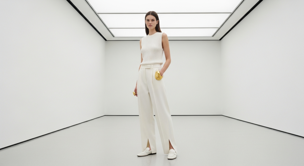 Think: a wide-leg ivory trouser with a perfect break at the ankle, a sleeveless ribbed knit in matching ivory, and a minimal ivory leather loafer. The entire look exists within a single color and a handful of clean shapes. It is utterly, devastatingly chic.