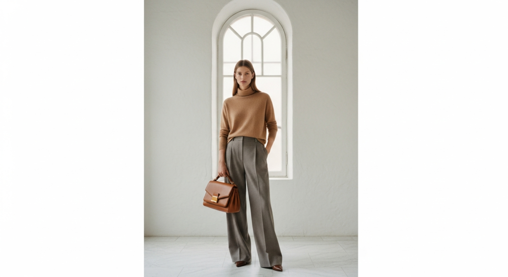 A soft camel cashmere turtleneck, wide-leg tailored trousers in warm grey, and a structured leather handbag in cognac is, in the quiet luxury universe, a complete and perfect outfit. Nothing needs to be added. Nothing needs to announce itself.