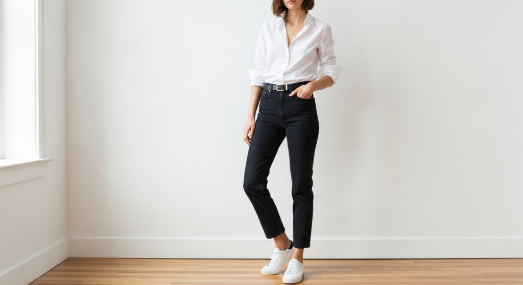 A white shirt that fits precisely through the shoulders and hangs cleanly through the body, worn tucked into dark-rinse straight-leg denim, finished with a thin leather belt, a delicate gold necklace, and a clean white leather sneaker — this is not a basic outfit. This is a chic outfit wearing the clothes of simplicity.