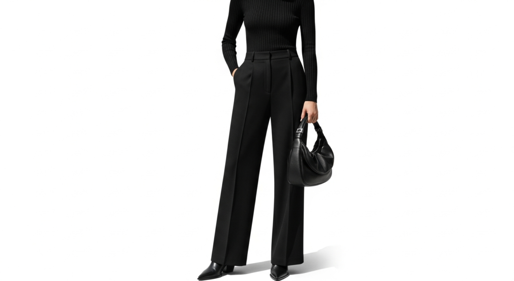 A fitted black ribbed turtleneck, wide-leg black crepe trousers with a clean front crease, a black structured leather handbag, and black pointed-toe ankle boots. This is an all-black outfit. It is also one of the most elegant things a person can wear.