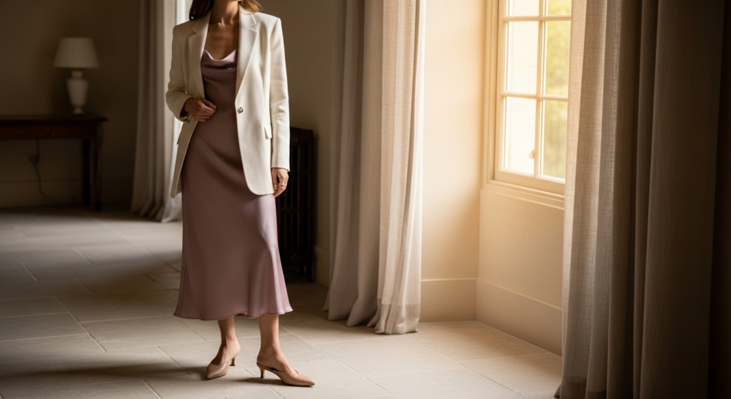 A bias-cut silk midi dress in a dusty mauve or champagne, worn with a structured blazer in a complementary neutral and low-heeled pointed-toe mules — this is feminine dressing with chic as its compass. The softness of the fabric and the cut are balanced by the architecture of the blazer and the precision of the footwear.