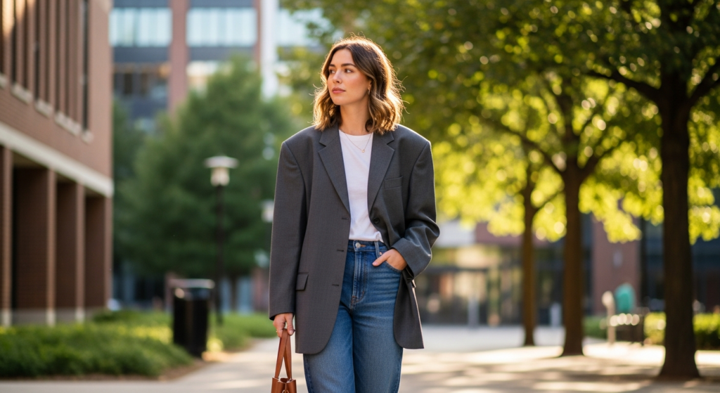 A relaxed blazer instantly elevates a simple jeans outfit. This look blends structure with casual ease.