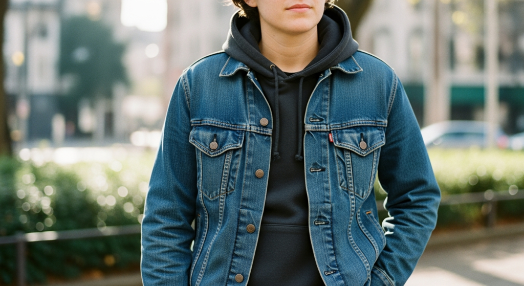 Layering a hoodie under a denim jacket creates a functional and stylish outfit for cooler days.