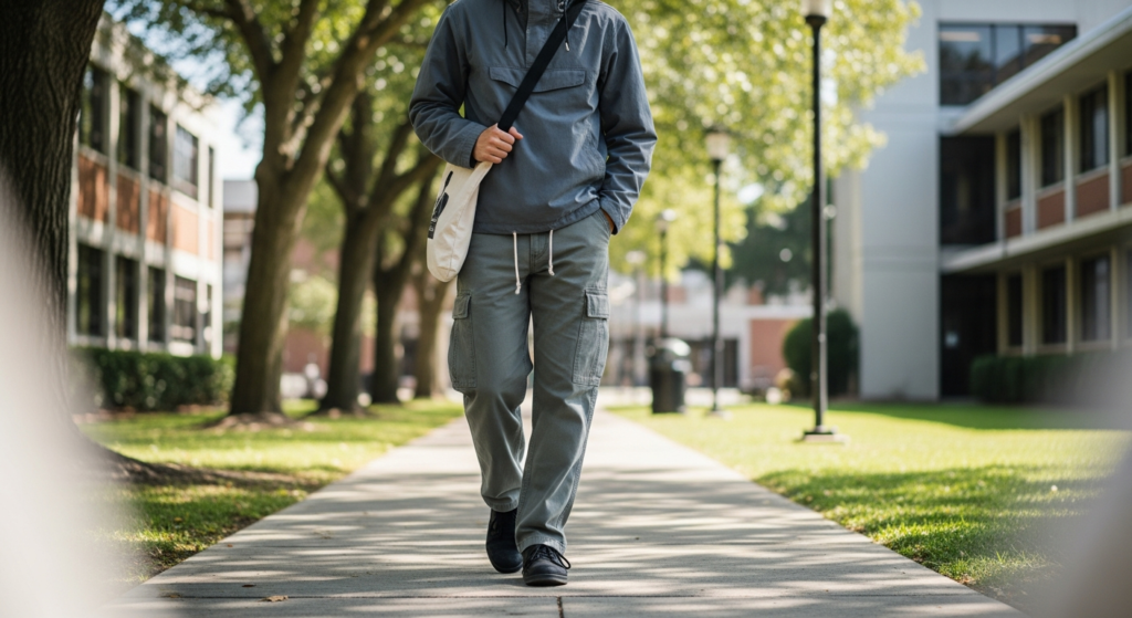 Cargo pants bring functionality, while a lightweight jacket adds structure and layering.