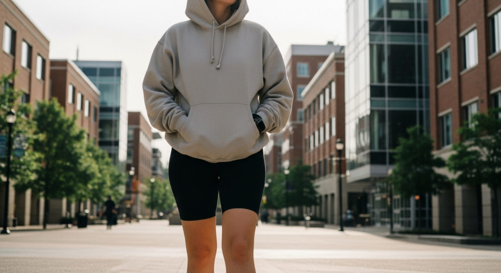This athleisure-inspired look combines comfort with a modern edge. An oversized hoodie layered over fitted biker shorts creates contrast and movement.