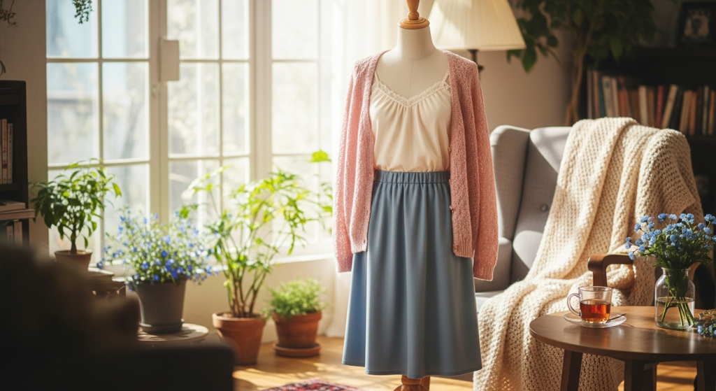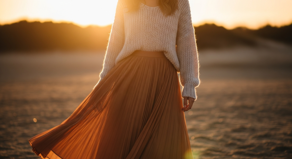 A pleated skirt brings softness and movement, while a knit sweater adds warmth and texture. This combination feels both classic and contemporary.