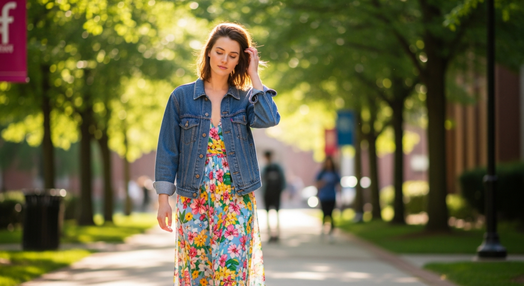 Layering a structured denim jacket over a flowy midi dress creates a perfect balance between casual and feminine.