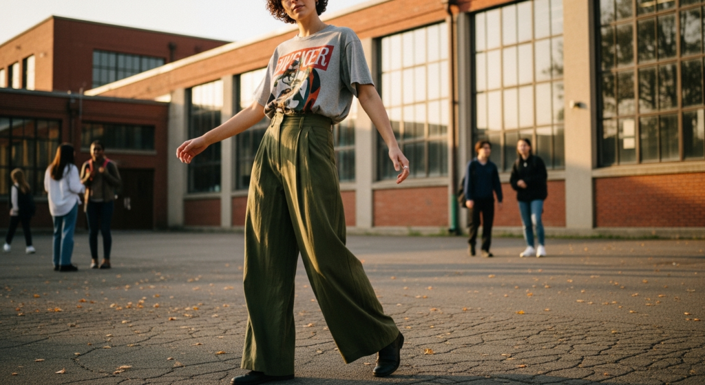 A graphic tee adds personality, while wide-leg pants introduce fluidity and modern structure.