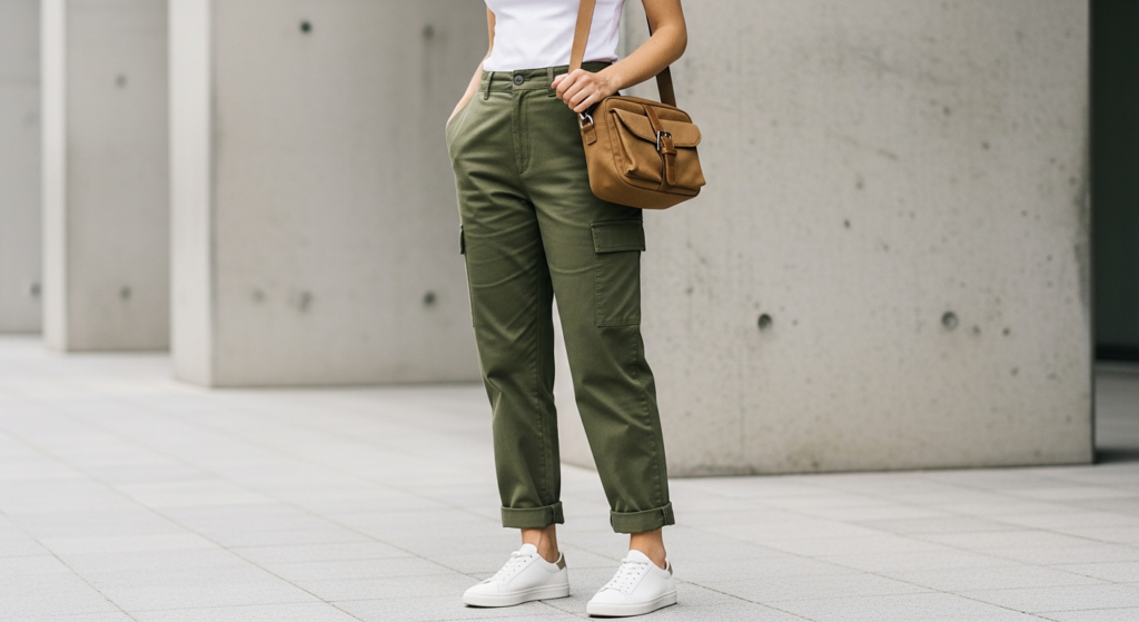 - White leather minimal trainers are the most universally popular and the most broadly photographed simple casual outfit footwear pairing for cargo trousers — clean, fresh, and effortlessly modern against the organic earthy tone of the cargo fabric.